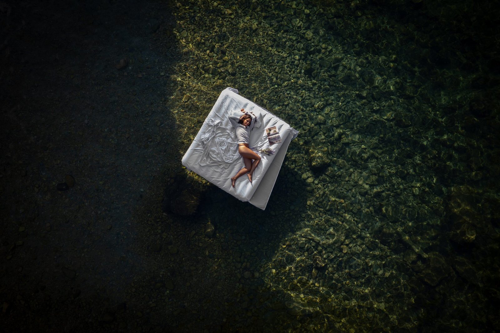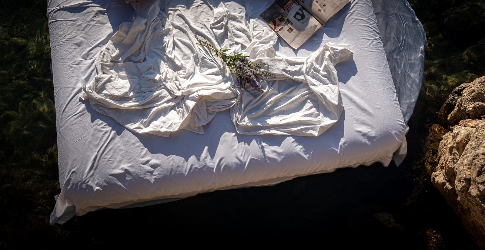 A bed floating at sea.